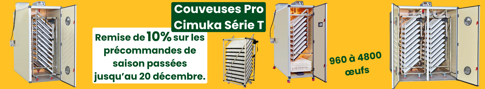 Bienvenue sur Eggceterra, votre spécialiste de l'élevage! Explorez notre gamme de Couveuses automatiques Cimuka T (960 à 10 000 œufs), conçues pour les éleveurs professionnels à la recherche de performances optimales. Fabriqués depuis plus de 40 ans, ces couveuses Cimuka ont conquis les aviculteurs du monde entier. Nos couveuses allient technologie innovante et fiabilité pour garantir le meilleur taux d’éclosion possible. Faites confiance à Eggceterra pour vos besoins en couvaison à grande échelle et découvrez comment nos solutions peuvent transformer votre élevage. Profitez dès maintenant de notre expertise et de notre service de qualité. Tous les modèles de la série T sont personnalisables, n'hésitez pas à nous contacter pour configurer l'équipement adapté à votre élevage.